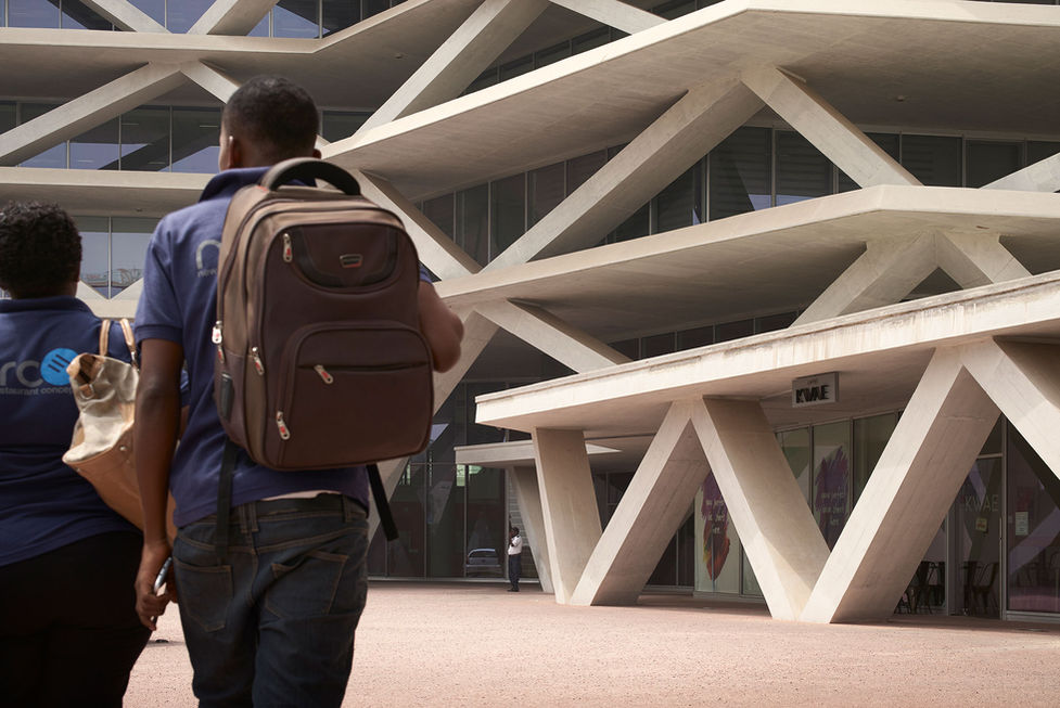 One Airport Square occupies a plot near Kotoka International Airport in Accra, Ghana. The nine-storey concrete structure integrates within the urban context and features offices, exhibition space, atrium and a public plaza. The energy concept allows for natural ventilation and reduction of the water demand. The high-tech office building contrasts with the surrounding landscape but morphs with the Ghanaian lifestyle.